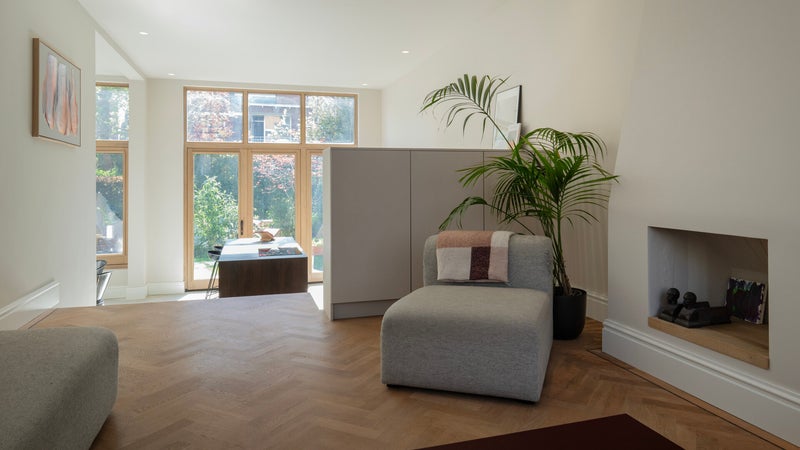 Keuken, trap en balustrade zijn als één samenhangend geheel ontworpen, wat zorgt voor een sterk ruimtelijk en esthetisch effect. De achtergevel is voorzien van een 3,5 meter hoge eiken pui, die zowel binnen als buiten een warme uitstraling geeft en op subtiele wijze contrasteert met het originele jaren 30-karakter van de woning.
